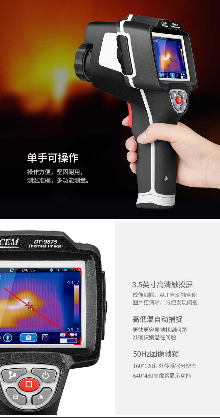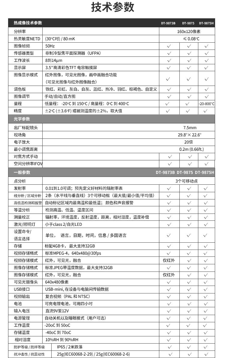 標(biāo)配鏡頭7.5mm,分辨率160×120,IFOV:3.33mard,視場角29.8×22.6°,熱靈敏度NETD<0.08℃,圖像幀頻50Hz,溫度范圍(-20-150、0-400),可見光分辨率640×480像素