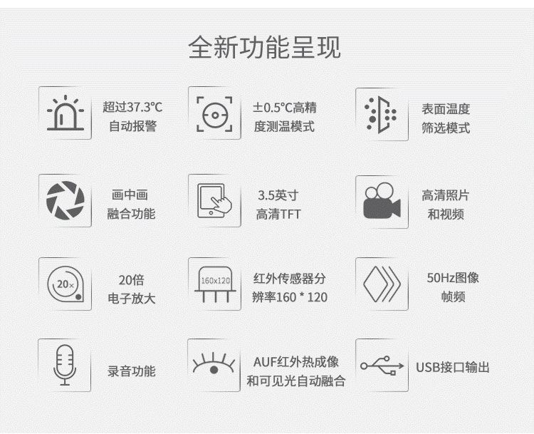 分辨率:160*120、圖像幀頻:50HZ、篩查測(cè)溫范圍:32-42℃、AV輸出大屏全屏顯示