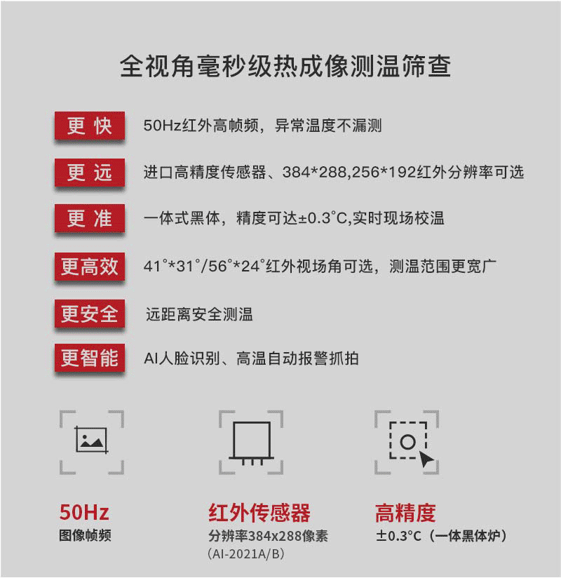 2安裝與維護(hù) 2-1,紅外熱像告警系統(tǒng)部署原則 Al-2021紅外熱像告警系統(tǒng)屬于精密測溫和成像設(shè)備,對部署應(yīng)用有一定要求,注意事項(xiàng)如下: ·安裝環(huán)境:設(shè)備機(jī)頭所處位置需光線良好(照明度≥10OLux),應(yīng)避免處于逆光的位置;設(shè)備機(jī)頭布置位置附近3米范圍內(nèi)不應(yīng)有空調(diào)出風(fēng)口;設(shè)備機(jī)頭所監(jiān)控的視場內(nèi),不能受到光照、西曬等外界強(qiáng)熱源的干擾; ·機(jī)頭布置:合理布置A-2021機(jī)頭的位置,向下俯視角度為13°~15°;合理布局人員檢測位置和范圍,AI-2021機(jī)頭的攝像頭距離被測人員的額頭的位置為1.0~5.0米,最佳測試位置為2.0米;