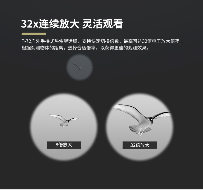 T-72系列熱成像儀望遠(yuǎn)鏡 ●384*288進(jìn)口傳感器 ●32倍連續(xù)放大靈活觀看 ●50Hz高圖像幀頻 ●WIFI連接實時圖像傳輸 ●可選外接大屏