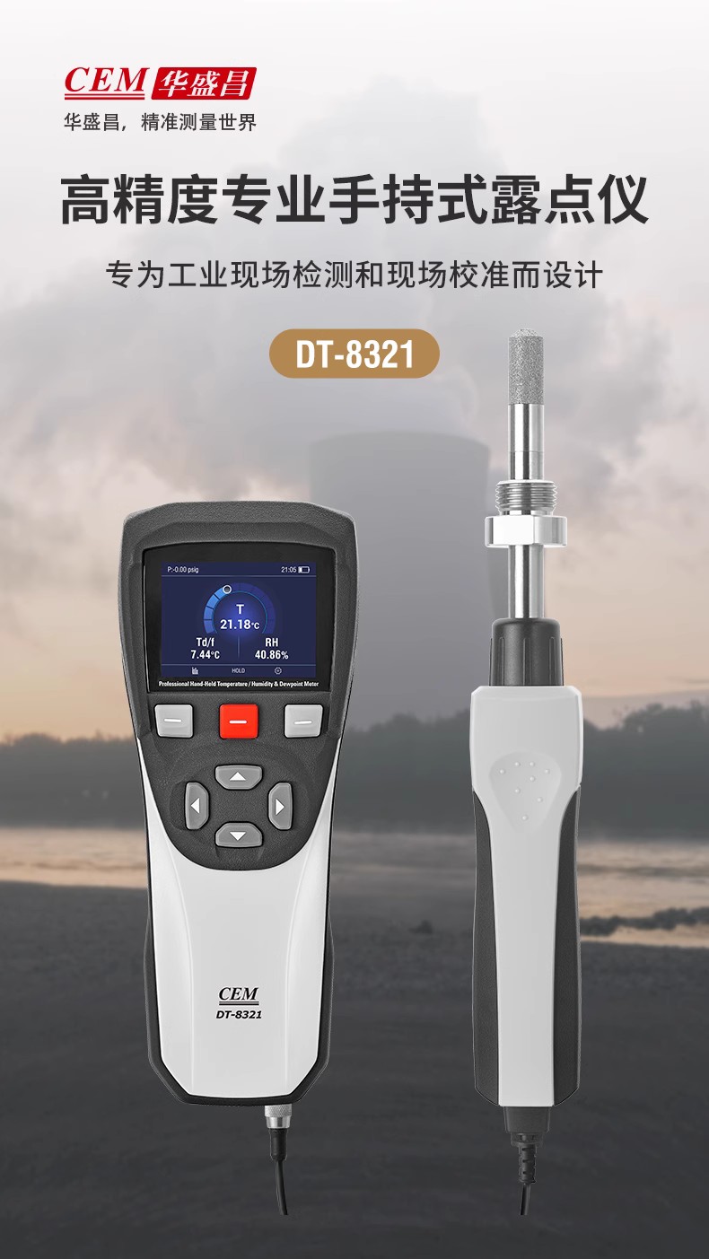 產(chǎn)品概述 CEM DT-8321是CEM華盛昌新設(shè)計、研發(fā)和制造的一款高精度專業(yè)手持式露點儀,精度高范圍廣,能在較寬的測量范圍內(nèi)準確測量露點溫度,探頭可直接插入加壓過程中,并快速響應(yīng)測試過程環(huán)境條件,為工業(yè)露點測量應(yīng)用提供準確快速的測量。產(chǎn)品廣泛應(yīng)用于實驗室、電力電氣、SF6氣體測量、精密制造、化工制藥等領(lǐng)域的大溫度、大壓力范圍內(nèi)的直接過程露點測量。 產(chǎn)品優(yōu)勢 性能穩(wěn)定,維修成本低,可專業(yè)用于工業(yè)現(xiàn)場檢測和戶外校驗等場合。 高品質(zhì)傳感器,測量更準確,適用于低露點測量。測量范圍達-50至+30°C,低濕度測量<5%RH?!駛鞲衅骺沙惺苣Y(jié),無需擔心結(jié)露影響測量精度。 傳感器探頭具備凈化功能以及加熱功能,預(yù)熱時間短,測量結(jié)果更穩(wěn)定。 靈活的數(shù)據(jù)記錄功能,可設(shè)置自動記錄間隔,CSV文件可以通過USB傳輸?shù)絇C端。 測量數(shù)據(jù)可一鍵保存,可使用電腦中的Excel軟件查看。 外形堅固,緊湊,小巧,外加藍色彩屏設(shè)計,界面更加直觀簡潔。 可充電設(shè)計,持久續(xù)航更方便。