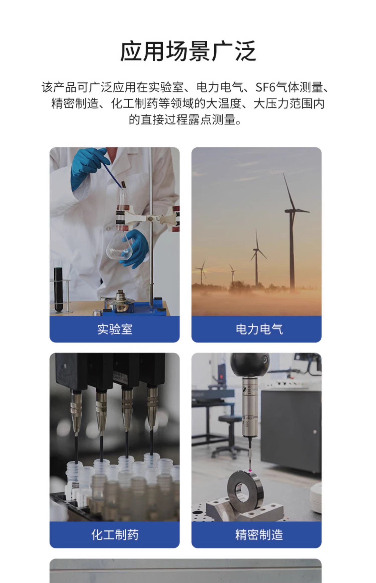 產(chǎn)品應(yīng)用 手持式露點儀是一種便捷、準確、可靠的空氣濕度測量設(shè)備,其在實驗室、工業(yè)生產(chǎn)、環(huán)境監(jiān)測等領(lǐng)域中具有廣泛的應(yīng)用前景。 實驗室 在化學、生物、醫(yī)學等實驗室中常常需要測量空氣中的相對濕度和露點溫度以掌握實驗條件。 工業(yè)生產(chǎn) 在制造、加工、儲存等工業(yè)領(lǐng)域中,可用于監(jiān)測空氣中的水分含量,保障生產(chǎn)過程的穩(wěn)定性和質(zhì)量。 環(huán)境監(jiān)測 在氣象、環(huán)保、建筑等領(lǐng)域中,可用于監(jiān)測大氣中的相對濕度、露點溫度等指標,以便更好地了解環(huán)境狀態(tài)。 工業(yè)應(yīng)用 諸如空氣干燥設(shè)備、塑料注塑設(shè)備、手套箱干燥設(shè)備、鋰電池水分檢測、氫氣、二氧化碳、水份檢測等。