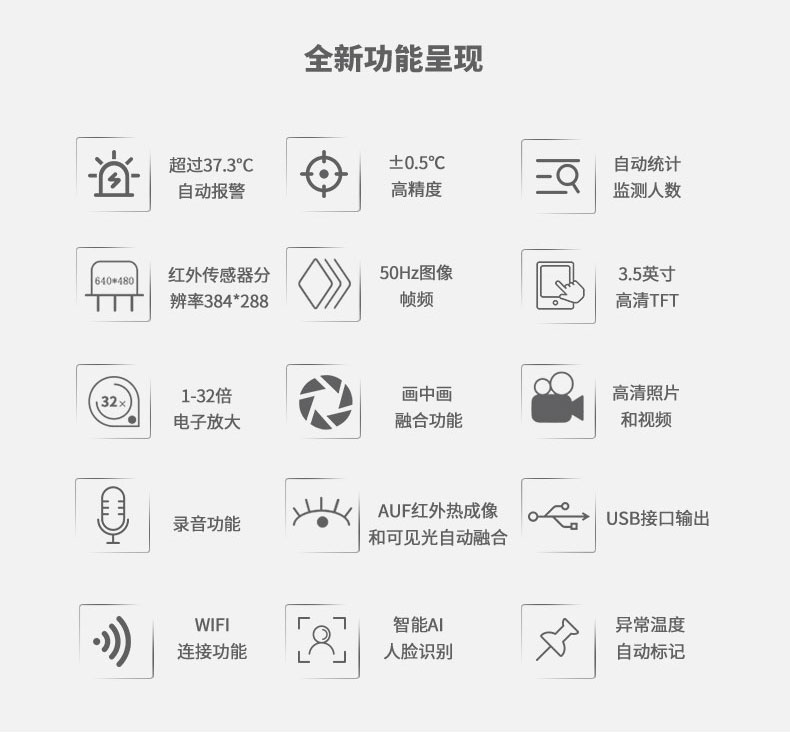 分辨率:384*288、圖像幀頻:50HZ、篩查測(cè)溫范圍:32-42℃、HDMI輸出大屏全屏顯示、AI人臉識(shí)別、自動(dòng)統(tǒng)計(jì)監(jiān)測(cè)人數(shù)、可同時(shí)完成多人測(cè)溫。
