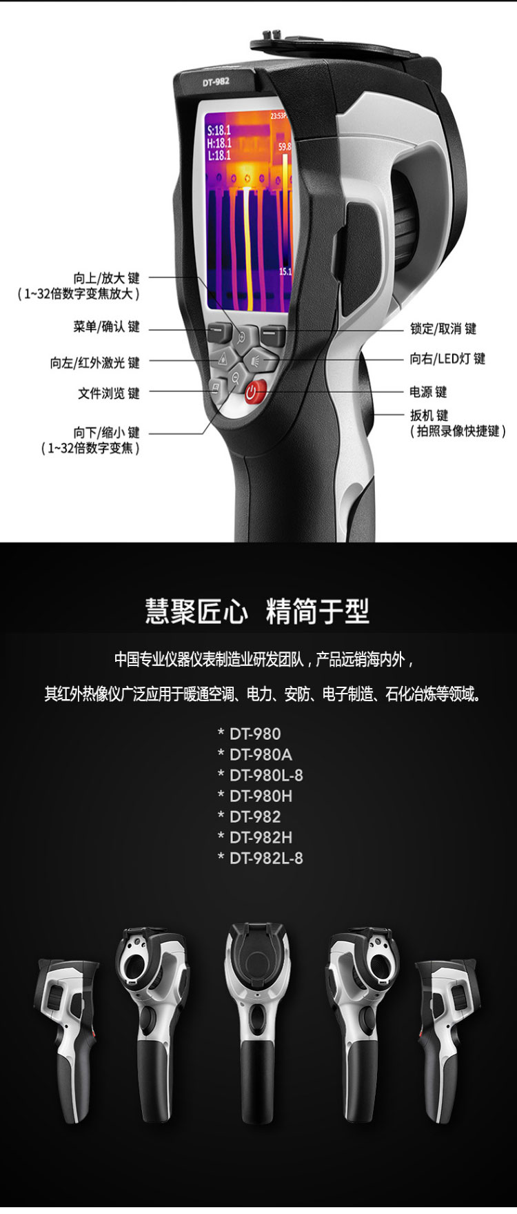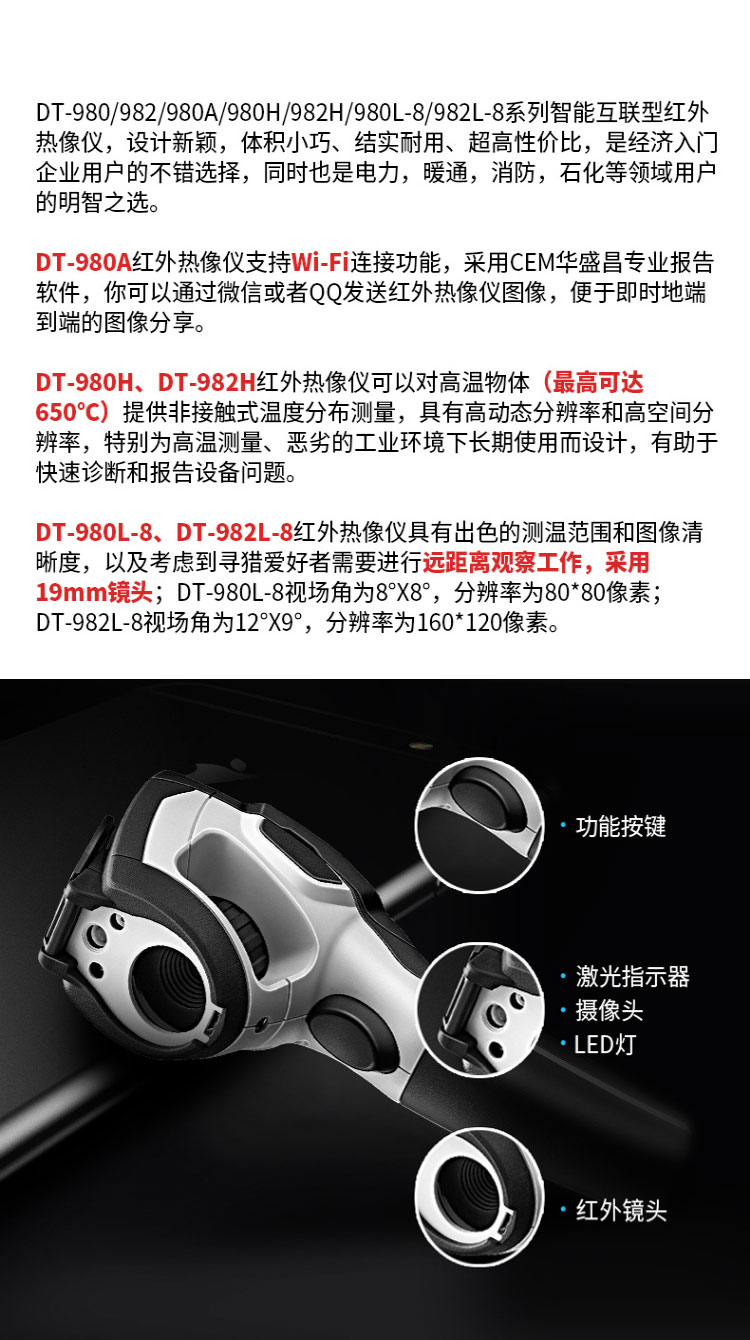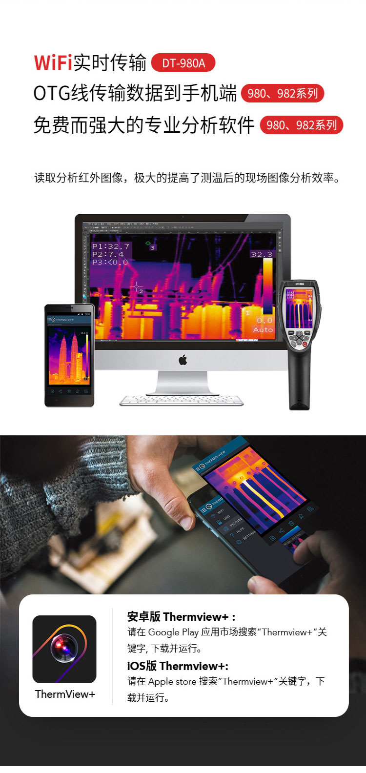 標配鏡頭7.5mm,分辨率80×80,IFOV:3.77mard,視場角17×17°,熱靈敏度NETD<0.06℃,圖像幀頻50Hz,溫度范圍(-20-150、0-650),可見光分辨率500萬像素