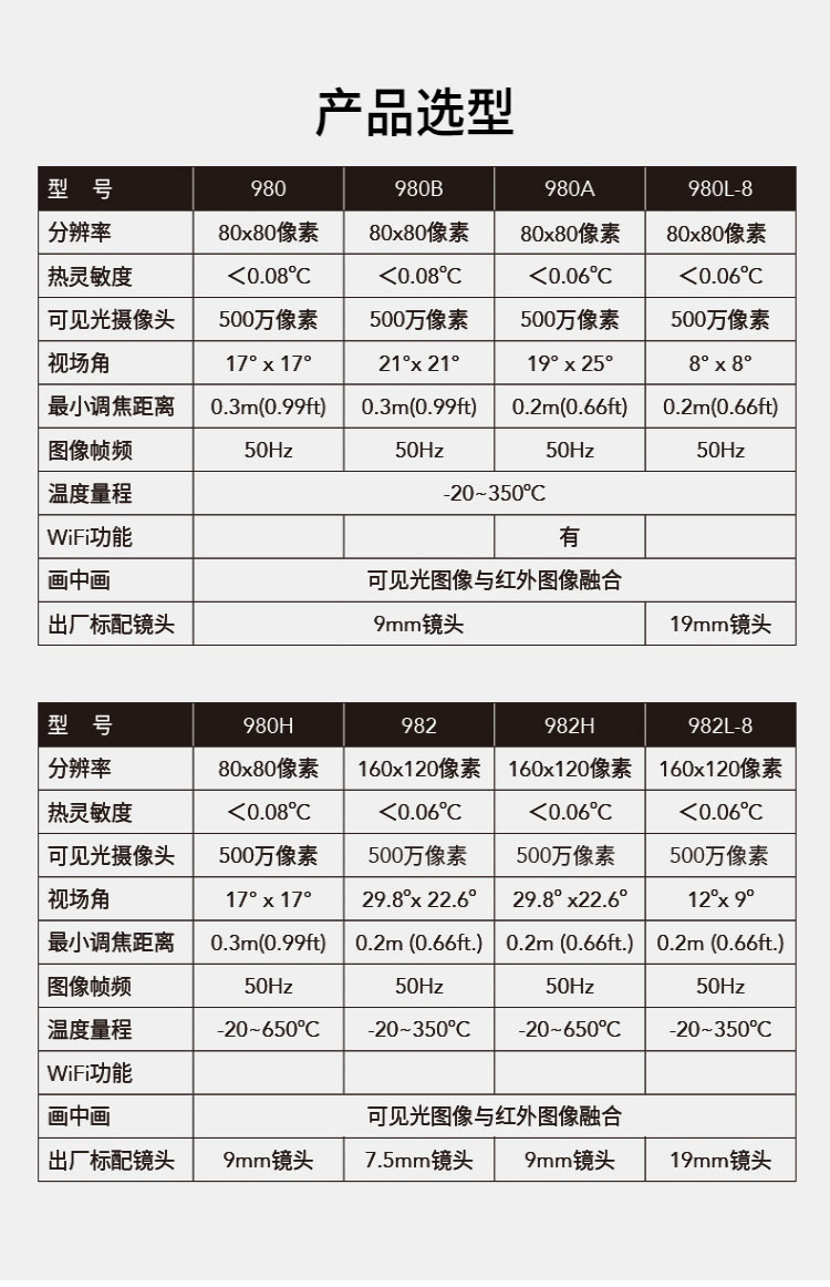 標(biāo)配鏡頭19mm,分辨率160×120,IFOV:1.79mard,視場(chǎng)角8×8°,熱靈敏度NETD<0.06℃,圖像幀頻50Hz,溫度范圍(-20-150、0-350),可見光分辨率500萬(wàn)像素