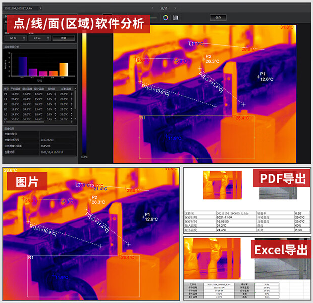 紅外圖像和可見光圖像的組合顯示,能更精準(zhǔn)地識別溫差,讓工程師可以更好觀察接觸點(diǎn)長期處于高溫狀態(tài)的情況,減少工作量。因?yàn)楣こ處熆筛鶕?jù)可見光圖片來判斷紅外圖片中熱點(diǎn)的未知,并自動生成報(bào)告,減少操作時(shí)間,提高工作效率。